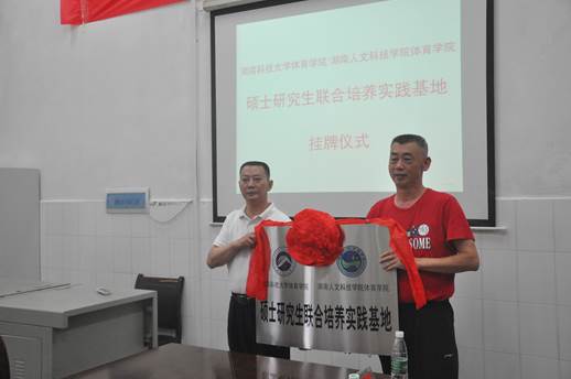 2017年6月23日下午5时许,由湖南科技大学体育学院李忆湘院长、胡斌梁书记带领的一行5人团队来太阳成官网体育学院举行两校“硕士研究生联合培养实践基地”挂牌仪式,副校长石潇纯、体育学院全体领导班子及部分教师参加会议。