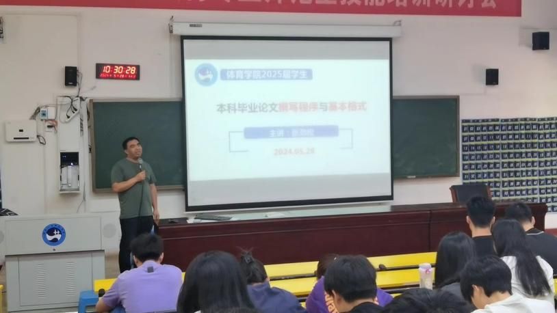 2024年5月28日上午10点30分,体育学院2025届本科毕业论文撰写辅导报告会在博达楼115教室准时开讲。本次讲座由体育教育专业负责人陈勤博士主持,张劲松副教授主讲,200余名2021级毕业班学生参与。