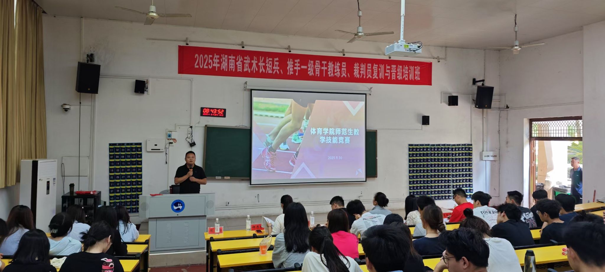 5月30日,体育学院师范生教学技能竞赛在博达楼115室隆重举行,来自2022级体育教育专业的40余名学子同台竞技,以饱满的教学热情和扎实的专业技能展现校企合作两周来的实践成果。体育学院副院长陈勤、体教专业负责人杨志华、实训中心主任杨岭出席活动,娄底市第一中学附属实验学校张松、第五小学戴敏、第六小学高向前等一线教育工作者及太阳成官网王金稳副教授、彭玉宇副教授、许子欣老师共同组成专业评审团,为赛事提供全方位指导。