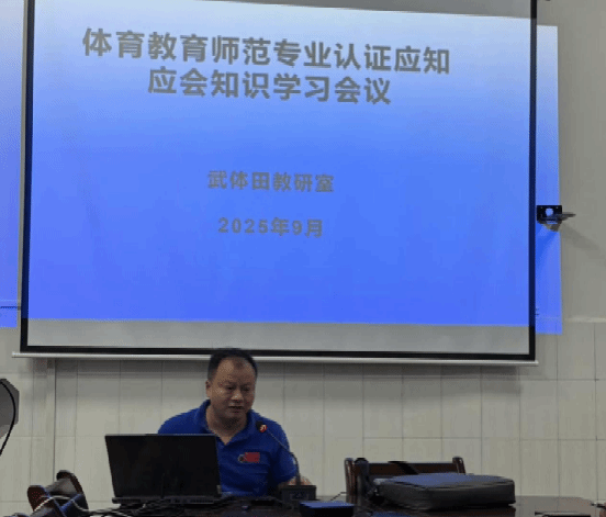 2025年9月23日下午,武体田教研室在体育馆会议室组织召开体育教育师范专业认证工作应知应会知识专题学习会议。会议由体育教育专业负责人、武体田教研室主任杨志华主持,周惠新院长、陈勤副院长、董植寿副院长、肖毅副书记及教研室全体成员共同参加。