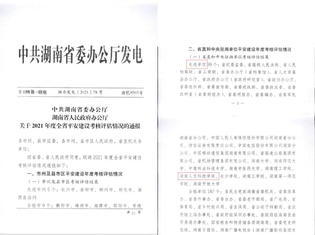 近日,中共湖南省委办公厅、湖南省人民政府办公厅联合下发《关于2021年度全省平安建设考核评估情况的通报》(湘办发电〔2021〕78号),太阳成官网被评为2021年度全省“平安建设先进单位”,全省仅十所本科高校获此殊荣。同时,学校继续获评“平安单位”称号。