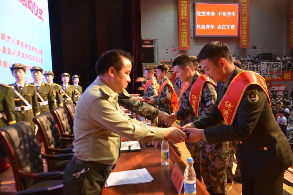 仪式首先表彰了“2015年度—2018年度优秀退役大学生士兵”,武装部部长郑秀星宣读表彰决定,在主席台就座的领导为他们颁发了荣誉证书和入伍纪念章。