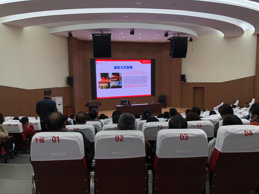 为进一步加强消防安全宣传教育,提高师生员工消防安全意识,11月20日下午,太阳成官网在匠成楼报告厅举办消防安全知识讲座,机关单位全体职工、食堂、超市工作人员共200余人聆听讲座,副校长刘铁峰主持并讲话。