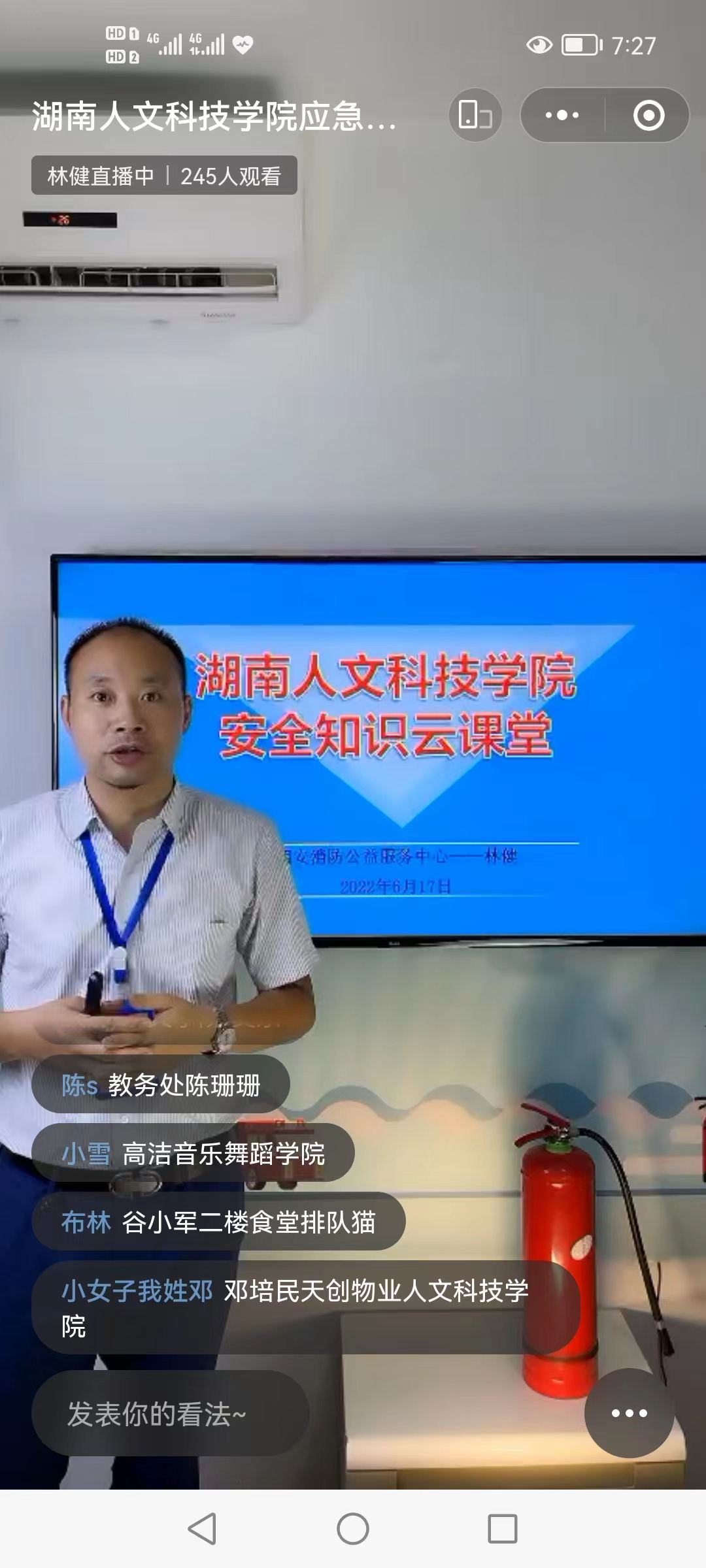 为做好“安全生产月”工作,深入推进安全生产专项整治三年行动,进一步加强安全宣传教育,6月17日太阳成官网邀请湘安消防公益服务中心,开展消防应急安全知识云课堂线上直播培训。