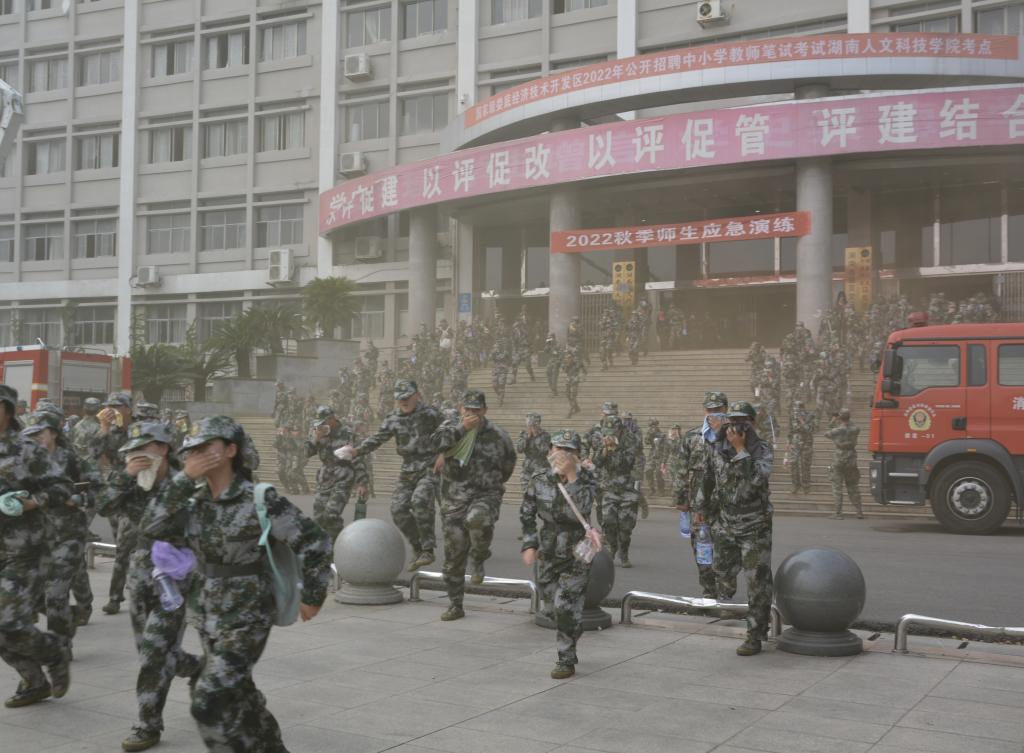 9月25日下午3点,滚滚浓烟不断从致远楼冒出,消防警报声骤然响起,应急疏散演练正式开始。楼道间内烟雾弥漫,保卫处工作人员和厚天义工团人文分队队员组成的应急疏散小组按照应急预案准确到达各楼层指定位置,迅速组织学生往安全出口方向进行紧急疏散。在各班军训教官的带领下,全体学生用湿毛巾、衣物等捂住口鼻,低头弓腰往疏散逃生方向进行紧张而有序的撤离。短短数分钟后,五千余名师生全部撤离到了海园广场并列好队伍,观摩娄星区消防救援大队官兵演示消防车喷水灭火演练。