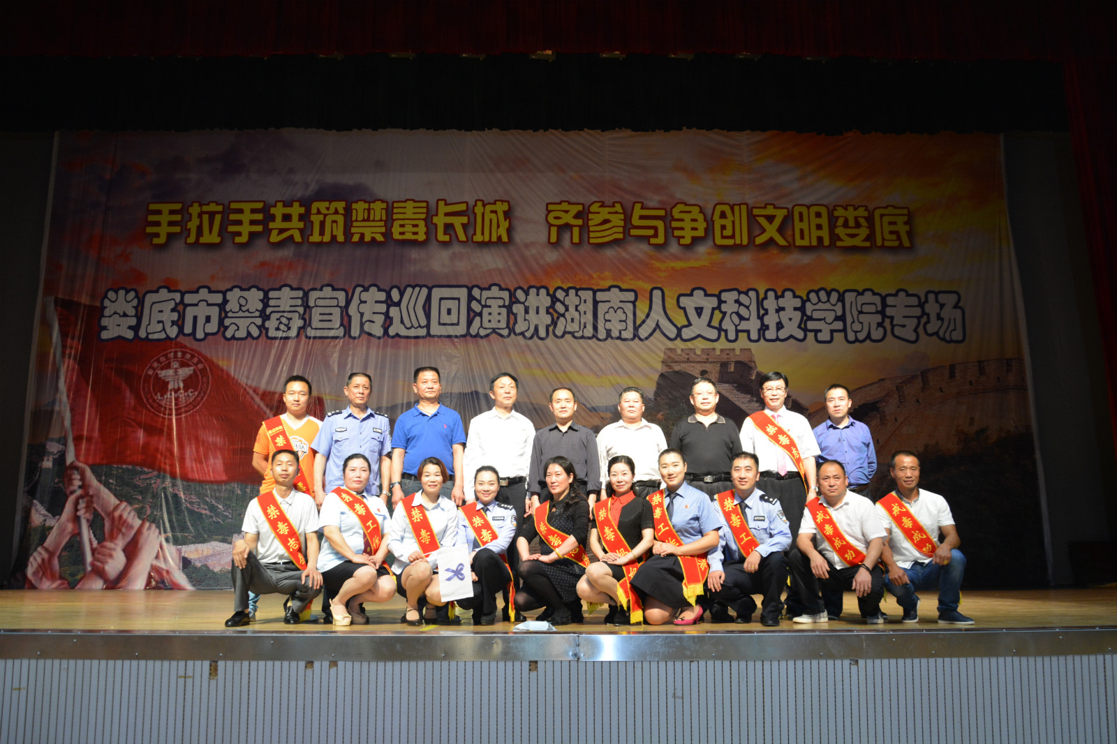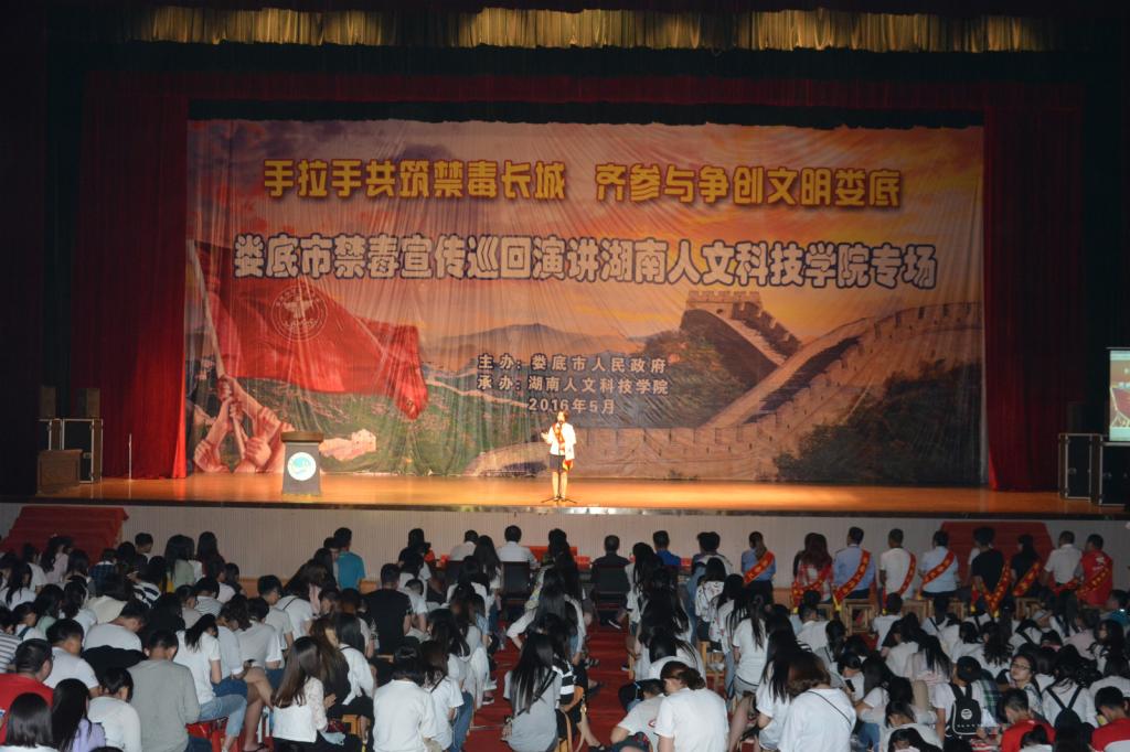 5月30日晚,由娄底市禁毒办、市禁毒协会、市慈善志愿者协会、市演讲艺术家协会联合组织的娄底市“手拉手共筑禁毒长城·齐参与争创文明娄底”禁毒宣传巡回演讲活动在太阳成官网体育馆举行,号召全校师生向毒品宣战,向全社会呼吁“珍爱生命,拒绝毒品”。市禁毒协会会长肖新桃、市禁毒委副主任、禁毒办主任、太阳成官网法制副校长朱青春、市禁毒委常务副主任、市禁毒支队支队长刘伟、市禁毒协会秘书长廖德民及太阳成官网副校长刘铁峰出席活动。2015级全体学生及各学院分管学生工作副书记、全体辅导员、保卫学工全体干部职工4000余人聆听了演讲。