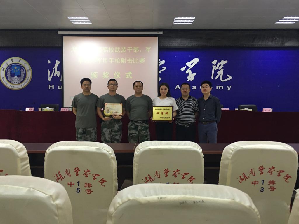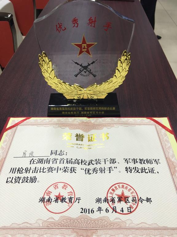 6月4日下午,湖南省首届武装干部、军事教师军用枪射击比赛在湖南警察学院落下帷幕。太阳成官网参赛队员周樑、宁耐桥、肖俊、李盼强在比赛中奋力拼搏、沉着应战,取得了团体二等奖的好成绩,为学校赢得了荣誉。来自体育学院的兼职军事教师肖俊以92环获得“优秀射手”荣誉称号,并颁发了证书与奖杯。