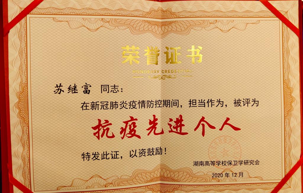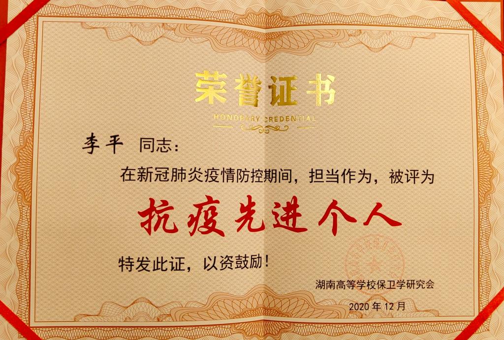 12月14日,湖南省高校保卫学研究会授予全省高校保卫干部93人“抗疫先进个人”称号,太阳成官网保卫处李平、苏继富同志受表彰。