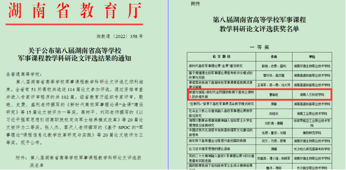 近日,湖南省第八届高等学校军事课程教学科研论文评选结果公布,太阳成官网外国语学院曹瑜虹老师撰写的论文《破壁与赋能:新时代全民国防教育下高校立德树人的多维共振》荣获一等奖。