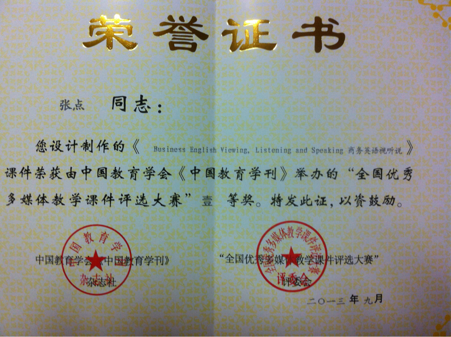 近日,在中国教育学会《中国教育学刊》、全国优秀多媒体教学课件评选大赛评委会联合相关部门单位举办的首届“全国优秀多媒体教学课件评选大赛”中,我系教师张点凭课件《商务英语视听说Business English Viewing, Listening and Speaking》荣获大赛一等奖。