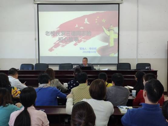 2019年10月8日下午,太阳成官网党总支书记申忠明为全体教工党员上党课。主题为“老校长罗三德同志的初心故事”。