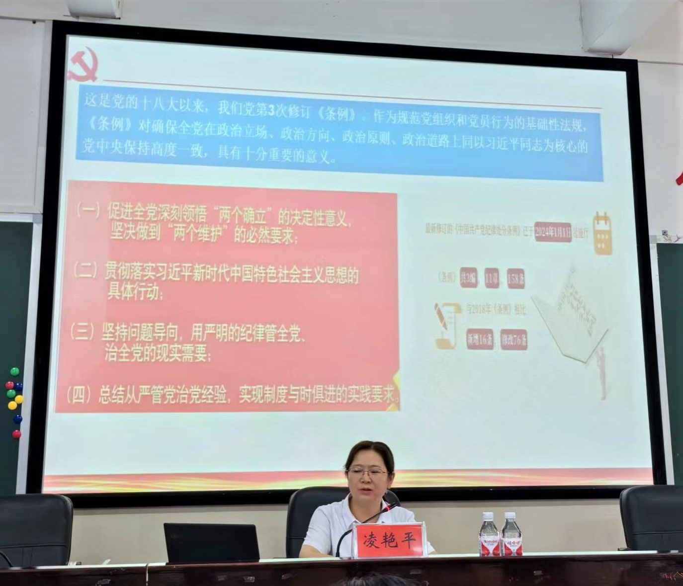 凌艳平以“学规矩,知敬畏,做遵规守纪的党员干部”为主题,带领大家深入学习了《处分条例》修订的背景、重要意义、整体框架及条例修订的特点,深入浅出地解读了《处分条例》要义,解读了新修订的《中国共产党纪律处分条例》,并结合部分典型案例,指导大家以条例为戒尺,将纪律化为自律。她强调,师生们要提高政治站位,原原本本、逐章逐条学好《处分条例》,做到学纪、知纪、明纪、守纪,将党的纪律规矩内化于心,外化于行,真正做好政治清醒的“明白人”、言行一致的“老实人”、清正廉洁的“干净人”、为民服务的“贴心人”、担当实干的“带头人”、洁身自好的“高尚人”。
