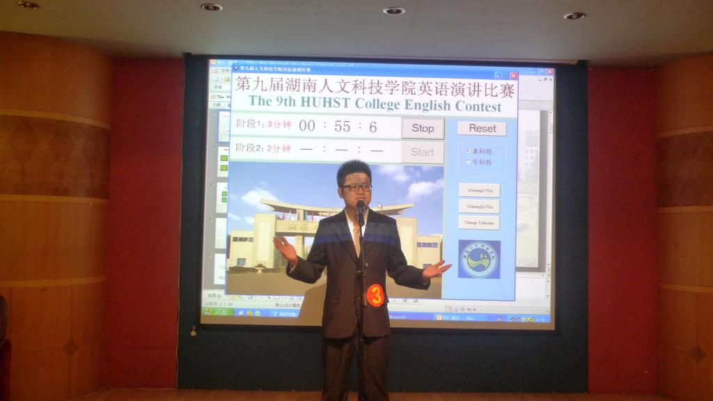 由教务处主办、外语系大学英语二课堂活动中心承办的44118太阳成城集团第九届大学生英语演讲比赛于2013年3月16日上午8点在养根楼多媒体报告厅拉开帷幕。来自全校各系部的十七名选手分成专业组和非专业组进行比赛。教务处彭秧锡处长、外语系朱芙蓉副主任、外语系刘莉副书记、大学英语教研室主任黄敏与龙少华以及蒋成、曾锦程、贺辉老师担任评委。