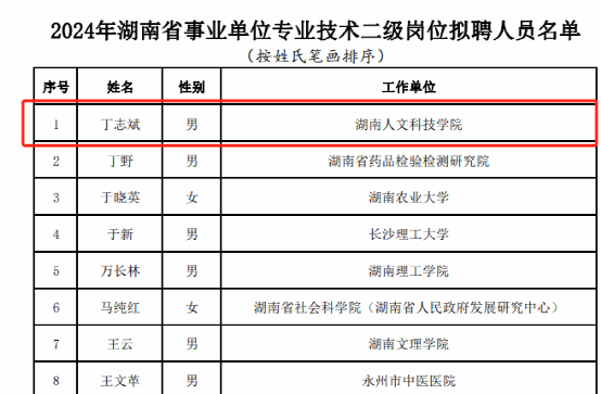 近期,湖南省人力资源和社会保障厅下发了《关于确认湖南省2024年事业单位专业技术二级岗位人员聘用资格的通知》(湘人社函[2024]117号),外国语学院教师丁志斌获评二级教授。