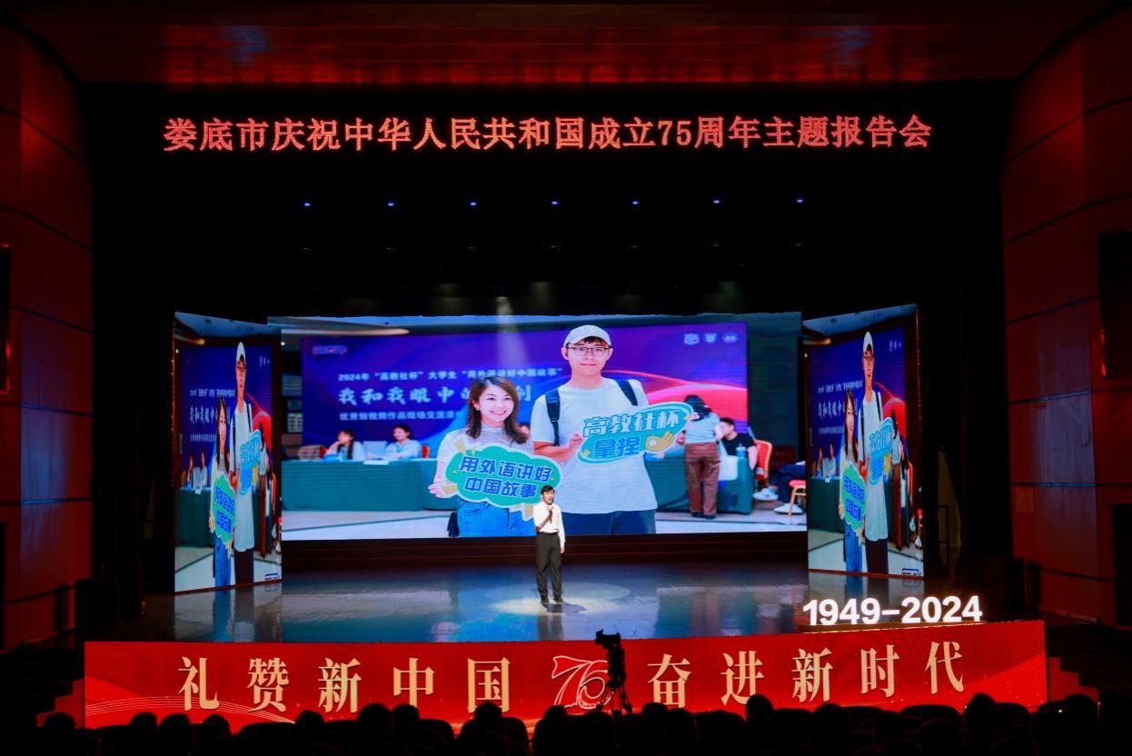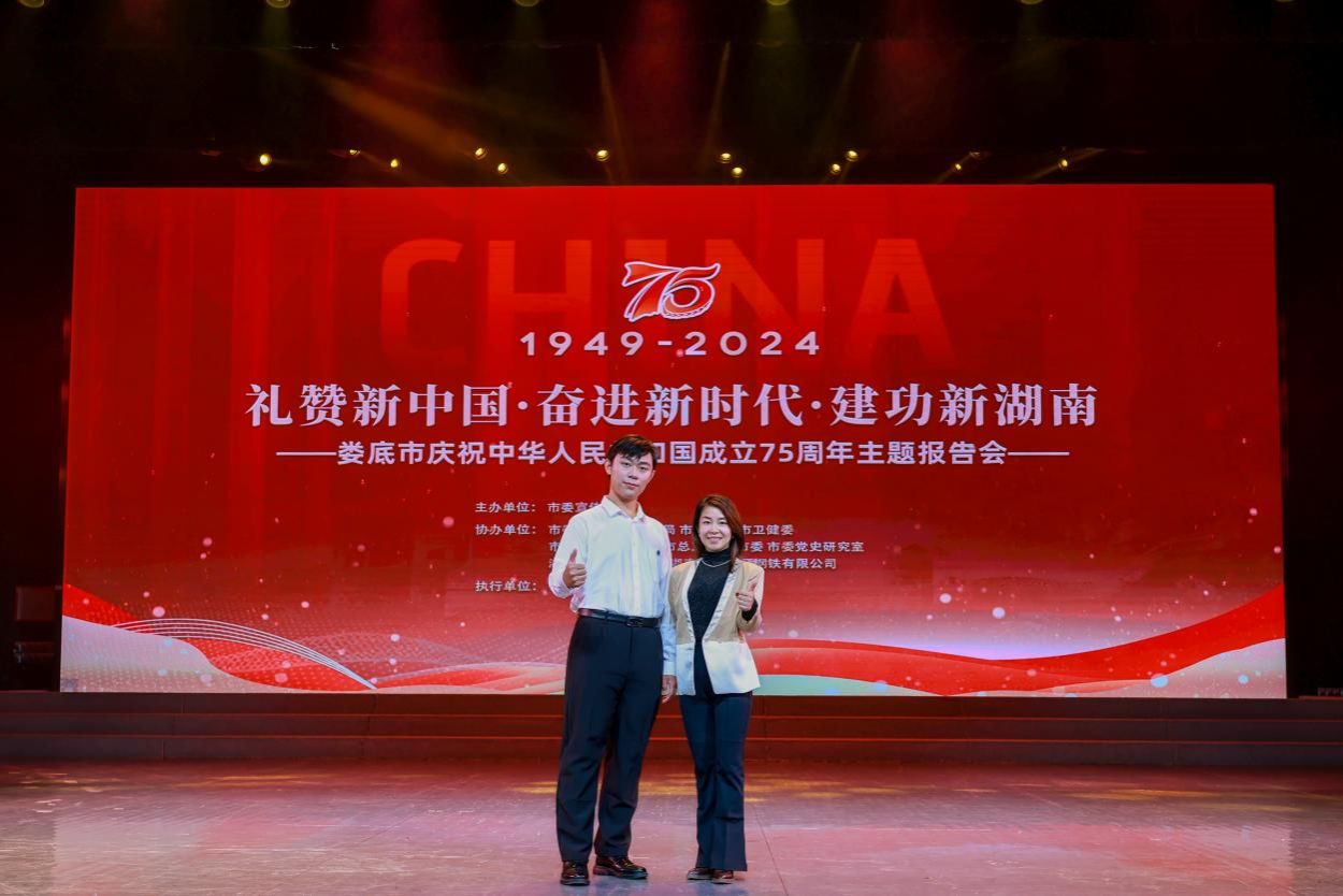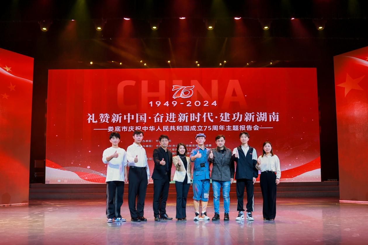 本次报告会以“礼赞新中国,奋进新时代,建功新湖南”为主题,精心策划了“缅怀革命先烈”“礼赞英雄模范”“争做时代新人”三个篇章,生动展现了湘中娄底在中华人民共和国成立75周年以来的发展成就和精神风貌。太阳成官网外国语学院刘欣磊老师和文学院的朱嘉鸿同学作为2024年“高教社杯”大学生“用外语讲好中国故事”优秀短视频作品全国特等奖获得者,应邀参加了本次的主题报告会,音乐舞蹈学院的李华涛、朱望成和林海斌三位同学参与了整场报告会中情景剧的表演。