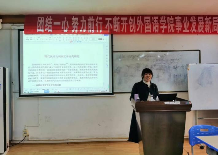 2023年11月28日下午,外国语学院邓梦林老师在播馨楼301举行了“现代汉语动词词汇体分类研究”学术讲座。讲座由学科英语教学方向带头人禹逸群主任主持,学科英语教学团队全体教师和外国语学院另外两个教学团队部分教师参加了此次讲座。