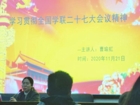 会议伊始,曹老师首先对于2020年8月成功召开的全国学联二十七大会议进行简单概述,介绍了会议人员、形式和主要工作。紧接着曹老师为学生解读会议内容,学习了解今后五年工作部署,并对会议要求做了强调。在学习会结尾,曹老师向学生传达了习近平总书记贺信精神并对外国语学院学生会工作内容作总结。