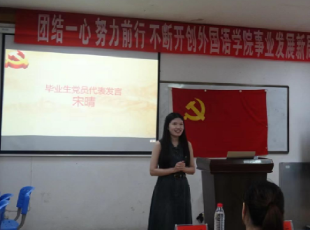 毕业生党员代表宋晴同志分享了自己的求学经历、入党经历。她立志于做一名人民教师,勤学苦练,努力成为一名“四有”好老师,以真才实学为祖国教育事业奉献出自己的青春和力量。