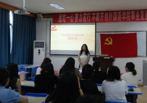 毕业生党员邹枝吟同志分享了大学期间学习生活中的感悟,感恩在党和国家的关怀下,感恩在学校老师的栽培下,有机会在实践中不断锤炼和成长,在今后的学习工作中积极进取,踔厉奋发,为母校争光。