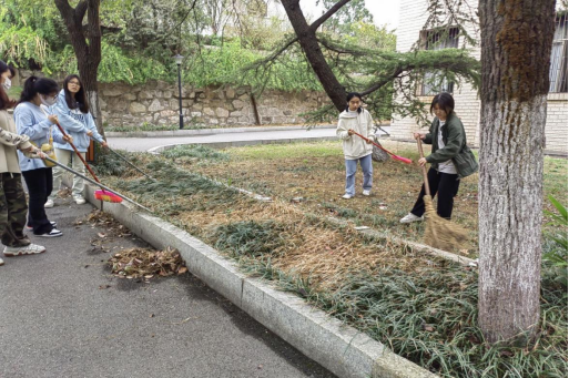 在人迹罕至的草地里,有经过了一个长假肆意生长的杂草,有在瑟瑟寒风中零落的枯叶,有来自动物们从四面八方收集来的“小礼物”们。虽然是很辛苦,但大家都有着撸起袖子加油干的进取精神,积极投身到校园卫生打扫的进程中来。