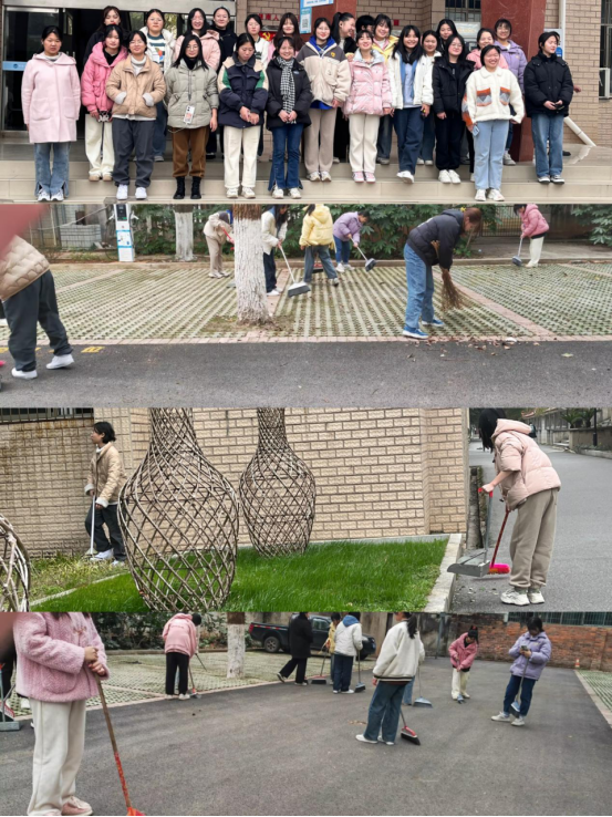 此次活动由外国语学院学生会勤助部组织,英语一班全体学生参加。在预定时间前,英语一班的同学们就已经扛着打扫的工具,奋斗在“守望花田”的第一线。班干们有序快速的分工,大家很快找到了自己的岗位,兢兢业业地开始干活啦!近几天的大风将许多枯叶不断吹到地上,形成了“树叶长道”英语一班的同学们有的比较直接,用手一大把地拾起落叶,让它去该去的地方。有的合作,直接用耙子和簸箕风卷残云。不一会,整个打扫区域就已经被同学们打扫的差不多啦,最后全体同学们播馨楼前合影留念。