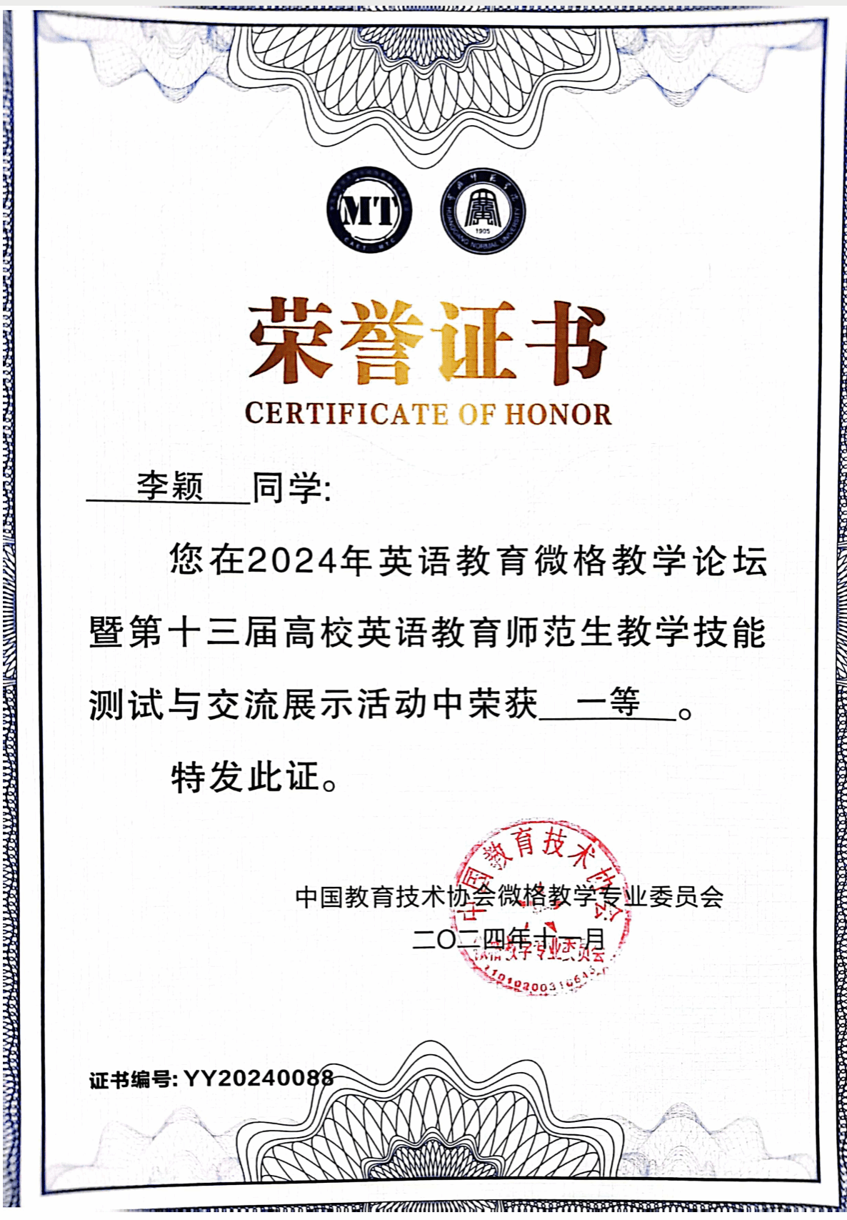 2024年11月获第十三届高校英语教育师范生技能大赛全国一等奖