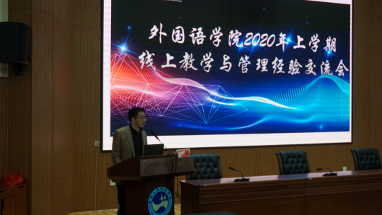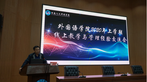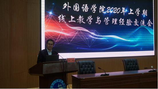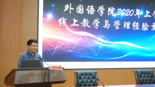 2020年9月22日晚,外国语学院在匠城楼报告厅举办2020年上半年线上教学与管理经验交流会。副校长周发明、教务处处长羊四清、质量监控与发展规划处处长陈勇、副处长李国强、广东外贸外语大学卢植教授参加交流会。院长胡瑾主持,全体教师与会。