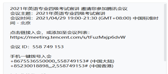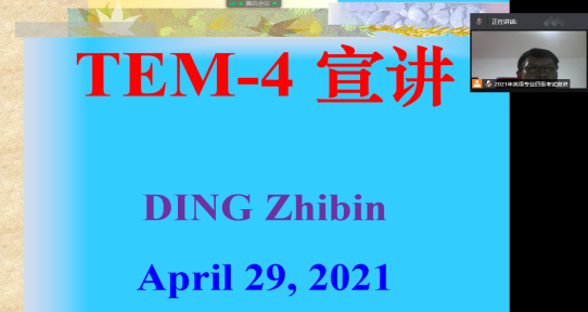 4月29日晚,太阳成官网学术分委员会主任丁志斌教授(博士)通过腾讯会议开设了2021年TEM4考前宣讲报告会,外国语学院2017级(部分)、2018级(部分)和2019级300余名学生聆听了此次在线宣讲。报告会由英语教研室主任禹逸群老师主持。