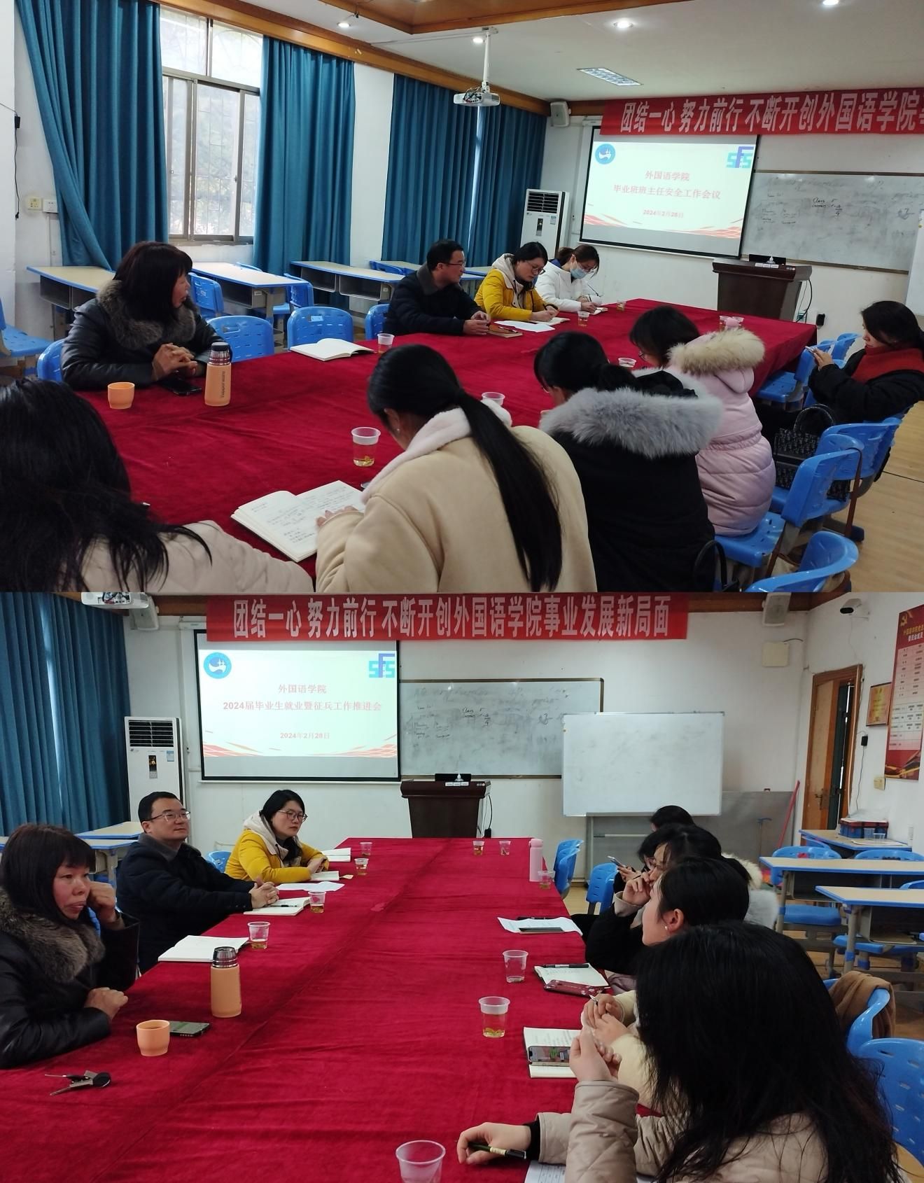 为进一步加强毕业生的教育管理,2024年2月28日,外国语学院在播馨楼301教室召开了毕业班班主任会议。院党总支书记阳立新,党总支副书记罗嗣安全体毕业班班主任和年级辅导员参加会议。