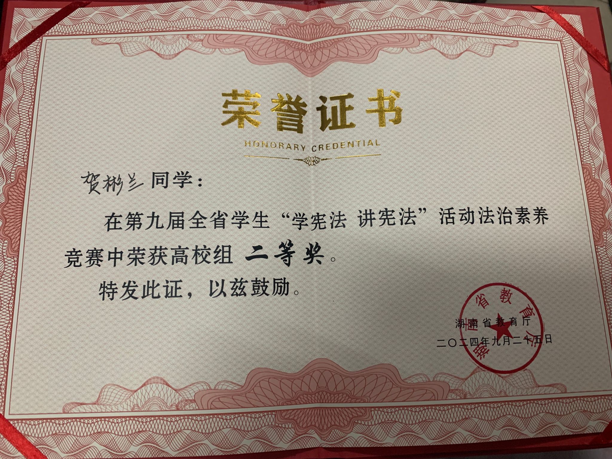 贺彬兰同学荣获全国学生“学宪法 讲宪法”活动高校组湖南赛区二等奖
