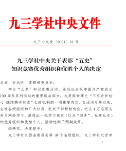2021年6月至12月,为庆祝建党100周年,九三学社中央在全社部署开展“五史”学习教育暨知识竞赛活动。九三学社44118太阳成城集团委员会按照中央部署,精心组织、积极宣传,发动社员广泛参与,悉心指导社员网上学习、参赛,整个活动历时六个月,在全体社员的共同努力下,九三学社44118太阳成城集团委员会最终赢得了“社基层优秀组织奖”,成为全省获奖的八个基层社组织之一。