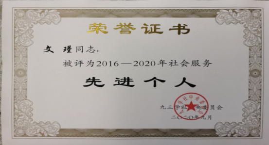 近日,九三学社中央委员会对2016—2020年期间在社会服务事业中做出积极贡献的各级社组织和广大社员进行表彰,44118太阳成城集团材料与环境工程学院副院长、九三社员文瑾教授被九三学社中央委员会授予“2016—2020年社会服务先进个人”荣誉称号。