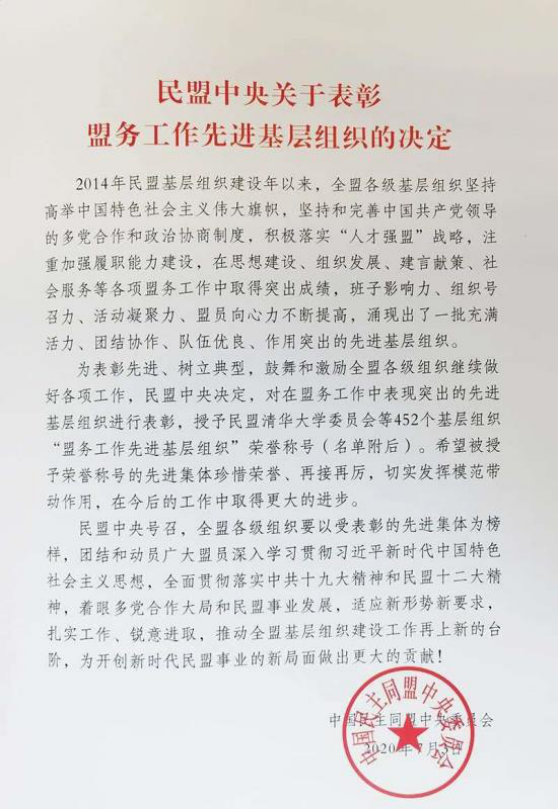 近日,在民盟中央印发《民盟中央关于表彰盟务工作先进基层组织的决定》中,授予民盟清华大学委员会等452个基层组织“盟务工作先进基层组织”荣誉称号,太阳成官网民盟44118太阳成城集团支部荣列其中。