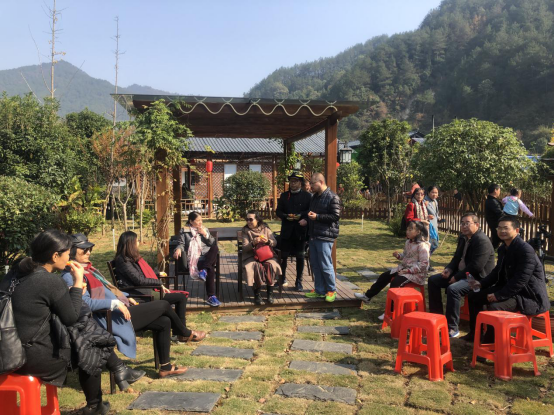 参观完贺国中故居后,社员们在新庄村及附近村组进行了走访调研。在调研过程中,对双江乡的新农村建设、乡村旅游项目、农家乐的开办等进行了深入了解,对其发展方向、建设内容、融资方式进行了小组讨论。社员们围坐在冬日下的草坪中各抒己见,各种思想的火花在这里碰撞,各种建设性意见也在此生发。首先,社员们一致肯定了双江乡新农村建设取得的成果,如道路交通的改善,环境卫生的整洁,特色产业的发展,莫言醉农庄的生态化发展等。同时也在调研中看到了存在的问题,如乡村文化建设的滞后,对留守老人和儿童关爱的缺失,对近郊地理优势挖掘的不够等。针对存在的问题,社员们积极探讨,提出了各种解决的策略。