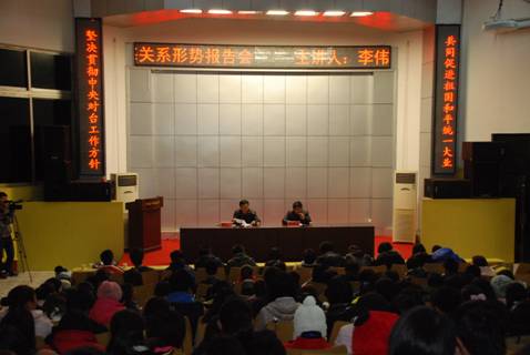 12月7日晚,匠成楼报告厅内座无虚席。娄底市委统战部副部长、市对台工作办公室主任、太阳成官网客座教授李伟智来校作台海关系专题讲座。校党委副书记李尚益,宣传统战部全体干部,部分政治辅导员,校系两级学生会、团委(团总支)的学生干部400多人参加了报告会。李尚益主持报告会。