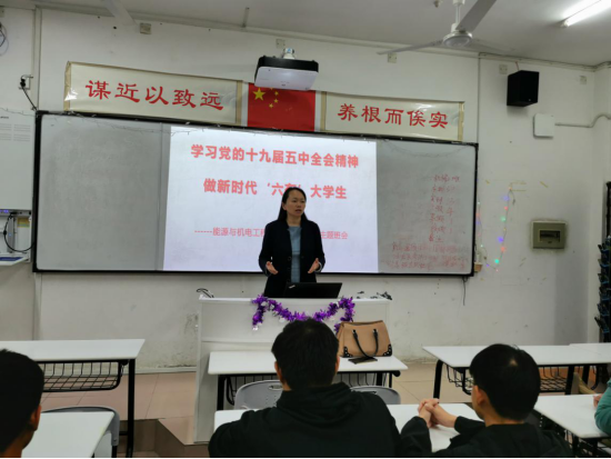 为深入学习贯彻党的第十九届五中全会精神,增强“四个意识”、坚定“四个自信”,激励同学们担当作为,奋发进取,把思想和行动统一到五中全会重大决策部署上来,2020年11月11日,能源与机电工程学院团总支召开了“学习党的十九届五中全会精神,做新时代‘六有’大学生”三联系主题班会。校党委委员、宣传统战部部长谢柳,校地校企合作处处长黎建辉、副处长周卫军,创新与创业学院副院长刘盛愚,能源与机电工程学院党总支书记彭辉、院长谢常清、副书记伍铁斌,2020级各班班主任老师、全体辅导员、学生干部代表等分别到相应“三联系”班级进行了指导。
