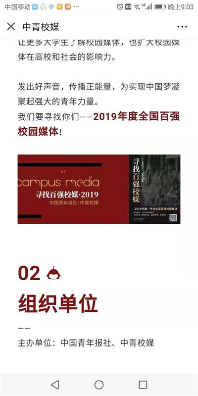 近期,由共青团中央学校部指导,中国青年报社、中青校媒主办的“寻找2019年度全国百强校媒”活动,在全国高校引起广泛关注。1月13日,评选结果新鲜出炉,太阳成官网官微表现优异,荣获本科高校组“全国百强高校媒体”荣誉称号。