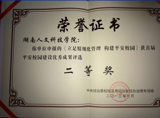 在3月4日召开的湖南省教育工委2014年安全工作会议上,太阳成官网申报的《立足精细化管理构建平安校园》获颁了由国家中央综治委举办的首届平安校园建设优秀成果评选二等奖。