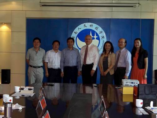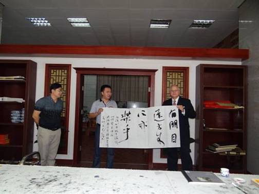 访问期间,约翰斐莱斯校长一行兴致勃勃参观了学校美术系与娄底书画院共同举办的产学研合作基地,客人对基地展示的非物质文化遗产和美术系师生的书法作品表示了浓厚兴趣,美术系老师、全国书法家协会会员易俊当场写下:“有朋自远方来,不亦乐乎”条幅赠送客人。