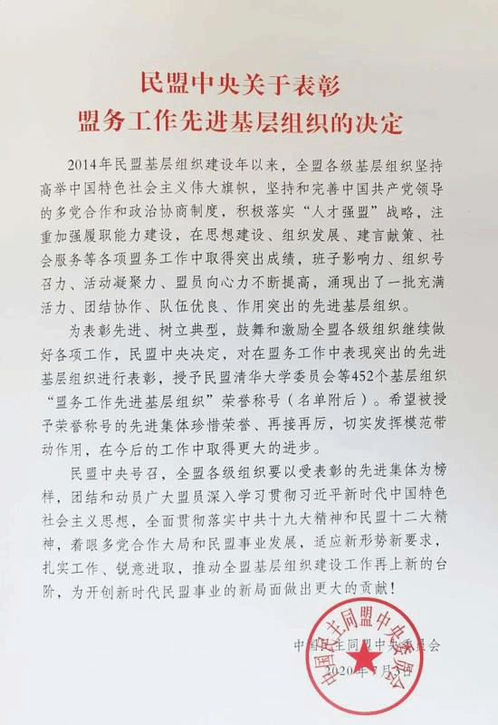 湖南日报·新湖南客户端9月7日讯(通讯员 谢四连)近日,在民盟中央印发《民盟中央关于表彰盟务工作先进基层组织的决定》中,授予民盟清华大学委员会等452个基层组织“盟务工作先进基层组织”荣誉称号,民盟44118太阳成城集团支部荣列其中。