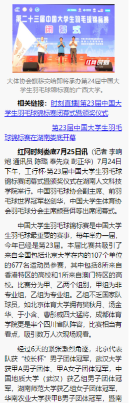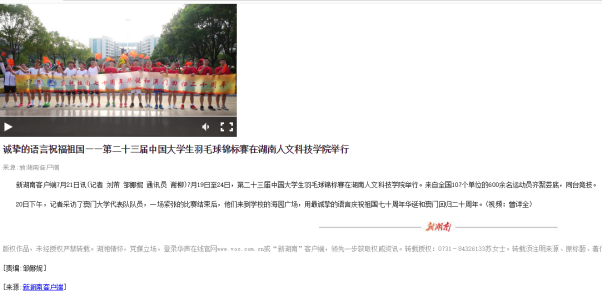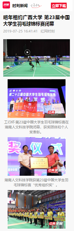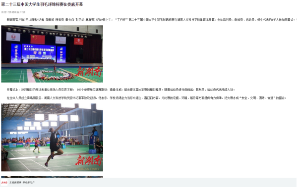 2.新湖南客户端:《第二十三届中国大学生羽毛球锦标赛在娄底开赛》(链接:https://m.voc.com.cn/wxhn/article/201907/201907192152062309.html?from=singlemessage&isappinstalled=0)