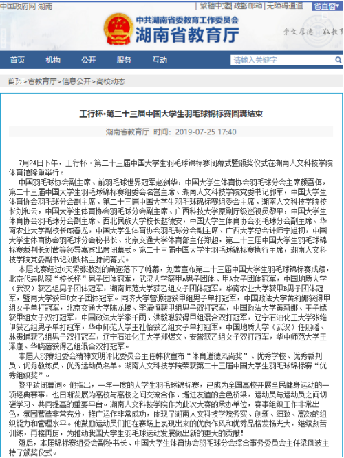 4.湖南省教育厅官网:《工行杯•第二十三届中国大学生羽毛球锦标赛圆满结束》(链接:http://ldrb.xxcmw.com/2019/07/20/index.html )