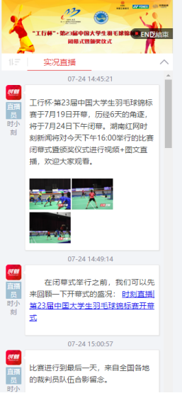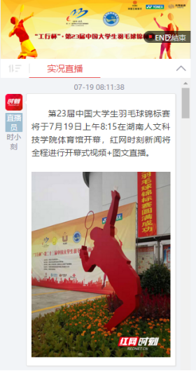 5.红网时刻:《“工行杯”·第二十三届中国大学生羽毛球锦标赛闭幕式暨颁奖仪式》(链接:https://moment.rednet.cn/live/index.html?liveid=1332&from=groupmessage&isappinstalled=0)