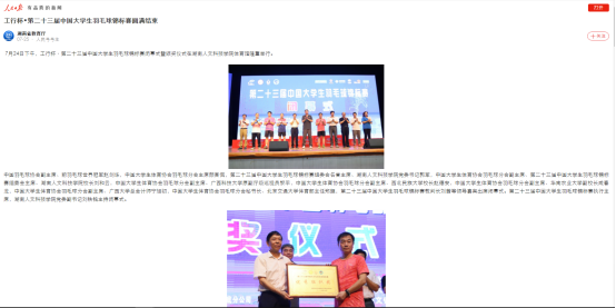 1.人民日报公众号:《工行杯•第二十三届中国大学生羽毛球锦标赛圆满结束》(链接:https://wap.peopleapp.com/article/rmh5796584/rmh5796584?from=groupmessage)