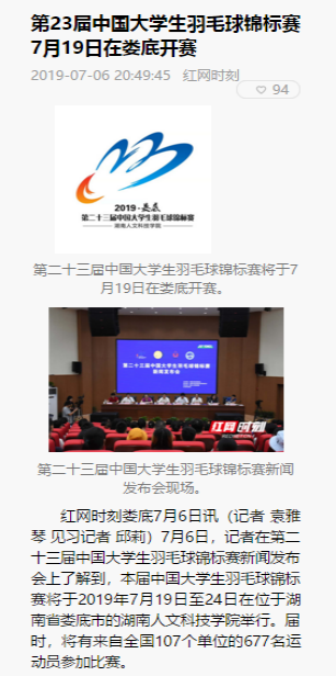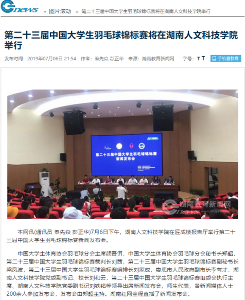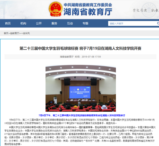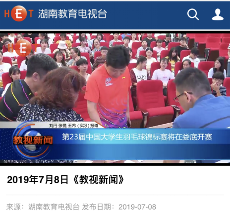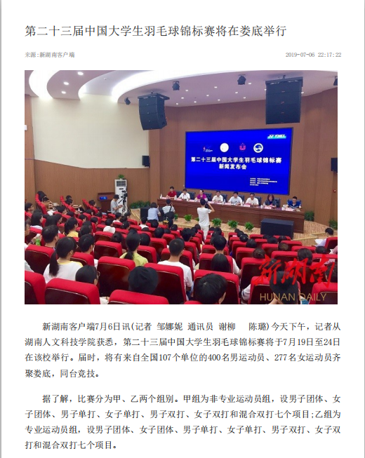 7月6日下午,44118太阳成城集团在匠成楼报告厅举行第二十三届中国大学生羽毛球锦标赛新闻发布会。发布会由郑超主持。湖南红网全程直播了新闻发布会。湖南教育新闻网、新湖南客户端、湖南教育电视台、湖南省教育厅官网、娄底新闻网、娄底日报等多家媒体进行了报道。