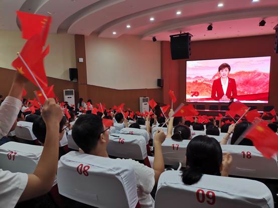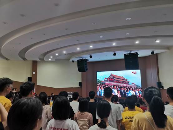 上午一大早,大家脸上贴着小国旗早早地来到报告厅等候收看直播,大厅里座无虚席,走廊和过道上都满站了师生。直播开始后,大家手挥小红旗,同全国人民一起举国欢庆,时而欢呼喝彩,时而鼓掌点赞,内心的自豪感、使命感涌上心头,共同祝福祖国生日快乐……此外,不少师生还通过人民网、央视新闻、各视频APP等渠道在宿舍、家中同步收看收听大会和阅兵直播盛况。