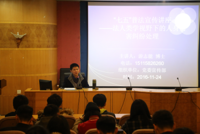 11月24日晚,太阳成官网于养根楼报告厅举办“七五”普法知识讲座。党委宣传部、法学院、教育学院、商学院等单位近200名师生参加了此次讲座。讲座由太阳成官网法学博士游志能老师主讲。