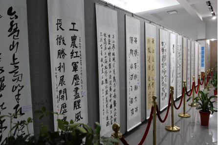 校领导一行走进展厅顿时被一幅幅精美的书画作品所吸引。在美术与设计学院党总支书记李小林和副院长谢雅强的导引和介绍下,他们时而驻足观看、细细品味,时而交换心得、热烈讨论。大家对作者的红色情感热情点赞、作品的精湛技艺众口称绝,并纷纷表示此次书画展内容丰富,形式多样,笔墨淋漓,大气磅礴,纵情讴歌了伟大的党、伟大的红军、伟大的长征,这对于大力弘扬伟大的长征精神,培育和践行社会主义核心价值观,唱响爱党爱国爱社会主义的时代主旋律,激发师生为建设全面小康社会而奋斗的热情,具有十分重要的意义。