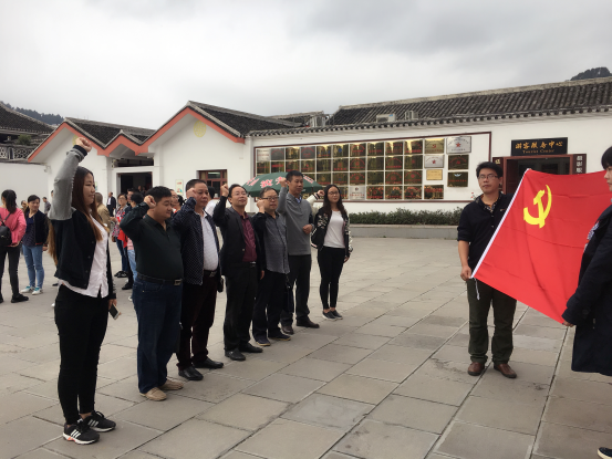 师生一行先后参观了四渡赤水纪念馆、丙安古镇和遵义会议会址。四渡赤水纪念馆位于习水县土城镇,作为全国爱国主义教育示范基地和国防教育示范基地,纪念馆系统的介绍了从一渡赤水到四渡赤水整个战役“出奇制胜”的全过程。不仅看到了革命先辈们为民族独立、人民解放而浴血奋战的伟岸身影,更亲身感受到他们为共产主义理想而顽强奋斗、至死不渝的崇高情怀,他们敢于斗争不怕牺牲的精神永垂不朽。随后一行人启程前往中国历史文化名村—丙安古镇。古镇内拥有着红一军团纪念馆等景点。在“红一军团陈列馆”中,展示内容包括挥师黔西北、鏖战赤水、四渡赤水和红色丙安四个部分,共展示图片资料278幅、文物128件,其中珍贵文物63件,全面地还原了长征中红一军团在赤水艰苦卓绝的征战过程,同时也让在场的师生们更深刻地了解到了红军长征中的在赤水中发生的这一最惊心动魄、精彩绝伦的军事战役。遵义会议是党的历史上一个生死攸关的转折点,它标志着中国共产党在政治上从幼稚开始走向成熟。来到这具有重大历史转折意义的会议旧址后,师生党员面向鲜红的党旗、齐举右拳庄严的宣读入党誓词,将共产党员的责任和使命永铭在心。随后,师生党员继续参观了遵义会议会址的各个纪念馆。其中新陈列馆整个馆内展陈内容分为“战略转移、开始长征”,“遵义会议、伟大转折”,“转战贵州、出奇制胜”,“勇往直前、走向胜利”,“遵义会议、光辉永存”五个部分,纪念馆以生动形象的文字图片以及文物展现了红军长征的光辉历史,传承和弘扬了伟大的长征及遵义会议的精神。
