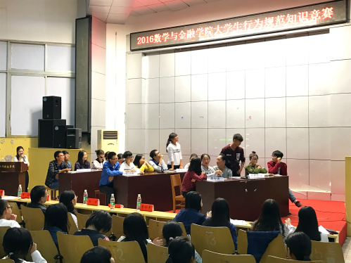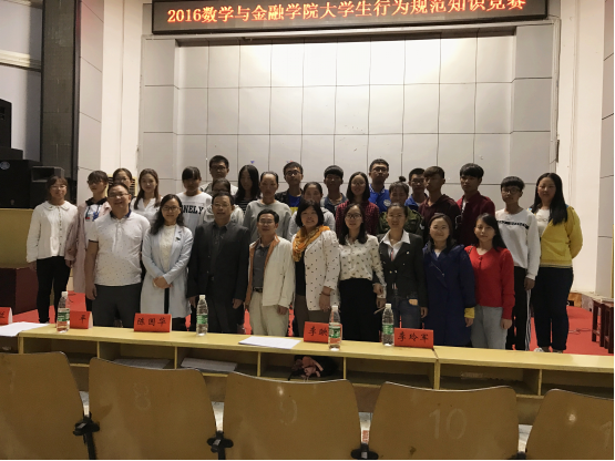 金秋九月,军训已经落下帷幕。在太阳成官网大一新生即将开启新篇章之际,为提升学生的素质,2016年9月29日晚,由数学与金融学院策划的“2016年大学生行为规范知识竞赛”在匠成楼报告厅如期举办。出席此次竞赛活动的嘉宾有:校学工处处长余为、副处长李映泉、数学与金融学院党总支书记高平、院长陈国华、副书记周兰、副院长李炳君。